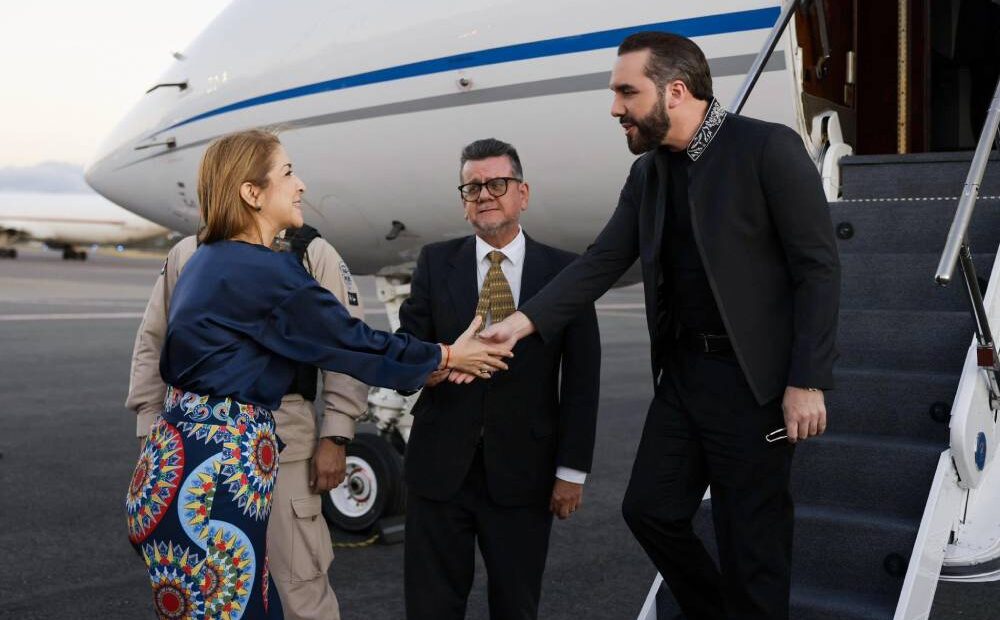Bukele arribó a la Base 2 del Ministerio de Seguridad, ubicada en el aeropuerto internacional Juan Santamaría, donde fue recibido por la vicepresidenta Mary Munive y el canciller Arnoldo André.